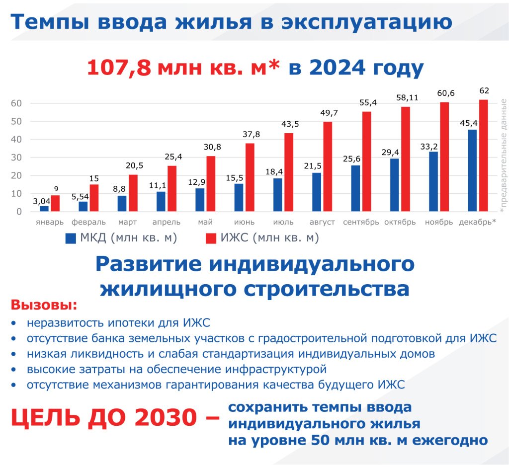 Вызовы, с которыми сегодня сталкивается рынок ИЖС, — неразвитость ипотеки; отсутствие банка земельных участков с градостроительной подготовкой для ИЖС и механизмов гарантирования качества будущего объекта ИЖС; низкая ликвидность и слабая стандартизация индивидуальных домов; высокие затраты на обеспечение инфраструктурой. А основная задача — сохранение на ближайшую пятилетку объемов ввода индивидуального жилья на уровне 50 млн кв. м ежегодно.