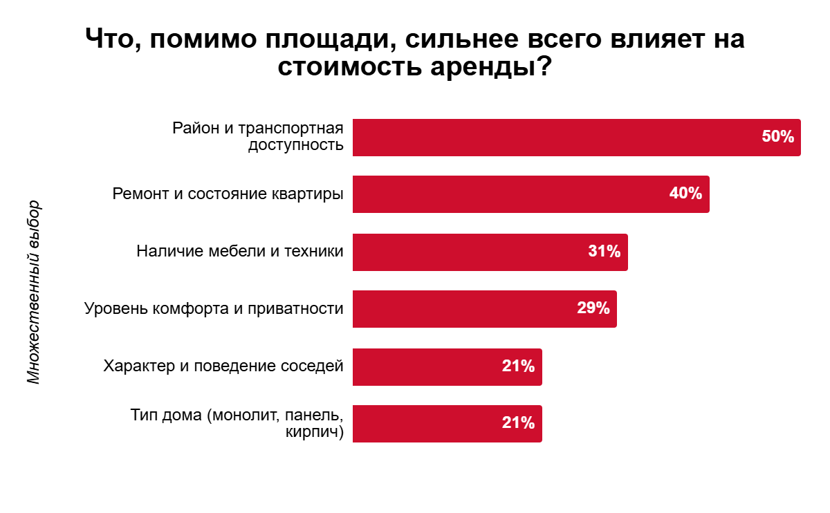 Что касается факторов, влияющих на стоимость аренды, кроме площади, 50% считают ключевыми район и транспортную доступность. На втором месте — ремонт и общее состояние квартиры (40%). Для 31% значимым фактором стало наличие в квартире необходимой мебели и техники. При этом 29% ориентируются на уровень комфорта и приватности, 21% обращают внимание на характер и поведение соседей, столько же — на тип дома, будь то монолит, панель или кирпич.