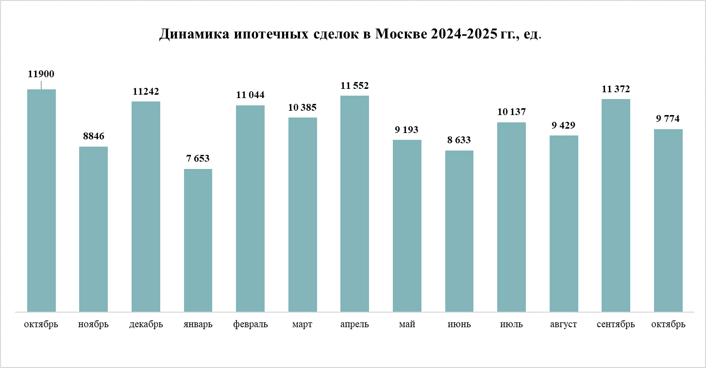 На ипотечном рынке в октябре 2025 года наблюдался спад активности после сентябрьского всплеска. Было зарегистрировано 9,8 тыс. кредитных сделок, что на 18% меньше, чем в октябре 2024 года, когда было заключено 11,9 тыс. соглашений. Относительно сентября 2025 года (11,4 тыс. сделок) спрос сократился на 14%. Такое снижение может быть связано с тем, что часть спроса, который должен был реализоваться в октябре, был удовлетворен еще в сентябре на фоне ожиданий по изменению кредитных условий.