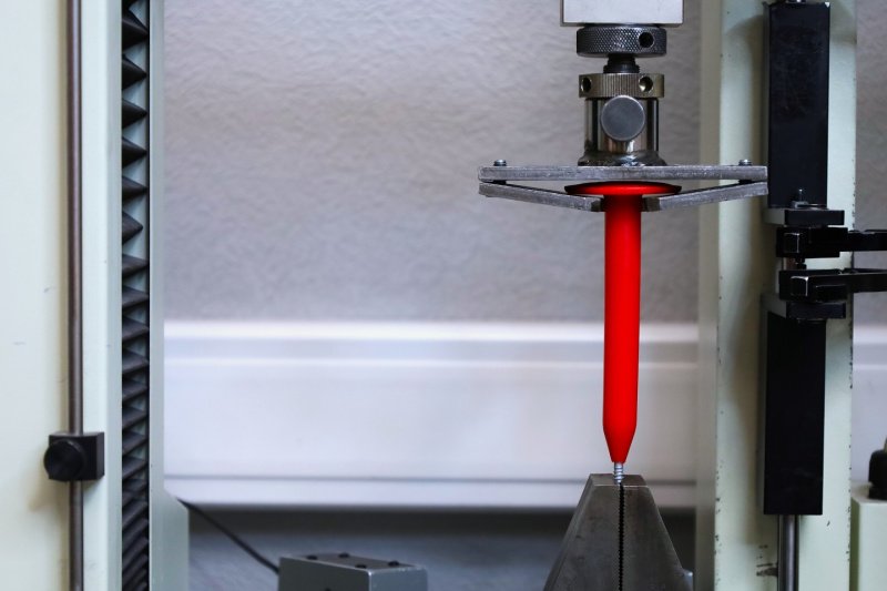 Кровельный крепеж должен выдерживать и динамические воздействия. Для испытания этого показателя полимерную втулку телескопического крепежа закрепляют под углом, и по ее краю наносят удар стальным цилиндрическим грузом, сброшенным с высоты одного метра. Так появляется возможность оценить хрупкость материала.
