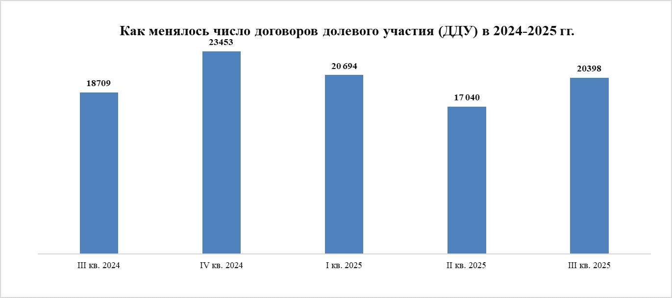 По итогам третьего квартала 2025 года было зарегистрировано 20,4 тыс. ДДУ. Этот результат на 9% превышает показатель третьего квартала 2024 года (18,7 тыс. ДДУ), что говорит о восстановлении рынка после резкого спада во втором квартале (-37% в годовом выражении).