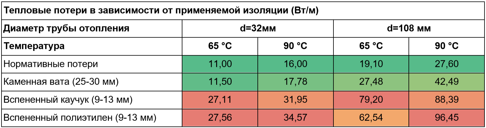 Толщина изоляции, при которой теплопотери будут оставаться в рамках нормы, должна составлять 25-30 мм, это следует из расчетов по СП 61.13330.2012. Применение более популярной, дешевой, но тонкой изоляции (всего 9-13 мм) приводит к существенным тепловым потерям: фактически в два-три раза выше допустимых. Так, при диаметре трубы отопления в 32 мм нормативные тепловые потери — это не более 11,0 Вт/м. С изоляцией толщиной в 25-30 мм теплопотери не превышают 11,5 Вт/м, а вот при толщине в 9-13 мм — достигают 27,6 Вт/м.